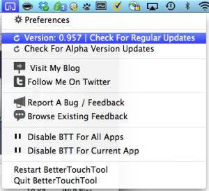 To download Better Touch Tool, head over to this CNET download page. Unlike before, this app is delivered in a zip file. Double click the compressed volume to see the Better Touch Tool app package, and then drag this app over to your Application Folder to install this tool. Double click the app from your Application folder to start it. You’ll now have a small icon at the top of your desktop that looks like a finger on a touchpad. Click on this icon and select “Check for Regular Updates” to ensure that you’re on the latest version.