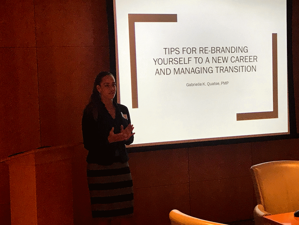 Gabby Quatse talked about her transition from being an Aviation Officer flying Blackhawks to an Engineering Director at Parsons. She offered many great suggestions for how to manage transition and rebrand yourself without losing balance in your life. Notice how her hand motions suggest that you can shape your personal brand as easily as manipulating a ball of clay.
